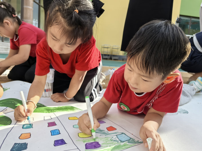 首先,老师们通过生动的图片和故事,为孩子们讲解了国庆节的意义和国旗的象征,在幼小的心灵中播下爱国的种子。随后,最引人注目的“亲子百米画卷”活动拉开帷幕。家长与孩子们齐上阵,他们或趴或坐,用手中的画笔尽情挥洒,将心中的祖国与美好祝福描绘在长长的画布上,构成一幅壮丽的爱国图景。与此同时,各班级的“亲子手工”活动也热闹非凡。一家人默契配合,制作出一面面鲜艳的五星红旗和精致的手工作品,现场充满了温馨与协作的暖流。最后,孩子们与老师一同观看了红色经典动画电影。银幕上英雄们的故事,吸引着孩子们的目光,让他们知道今天幸福生活的来之不易。