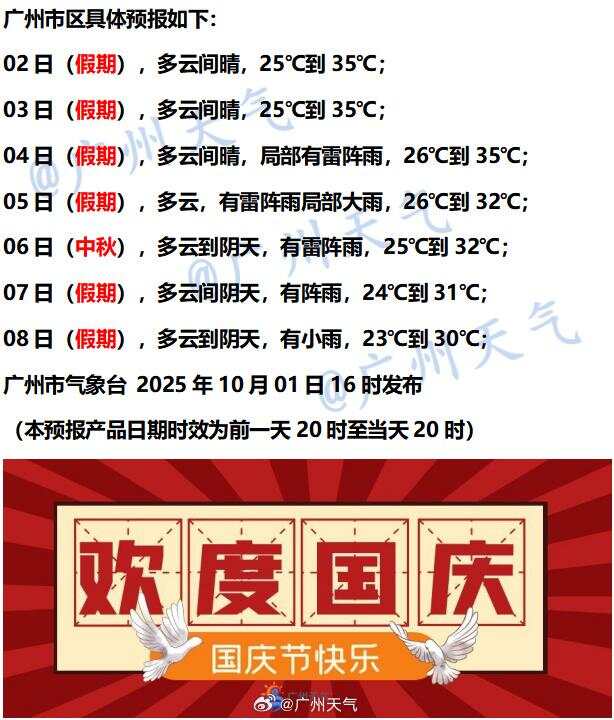 @广州天气预计,假期前期,广州以晴热天气为主,假期中期,有雷雨到访,大家出行记得随身带伞。
