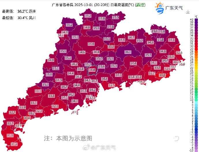10月1日,广东多地齐刷刷冲上30℃,不少市县还突破35℃大关,最终连州凭着36.2℃的成绩,稳稳坐上高温榜第一的宝座。