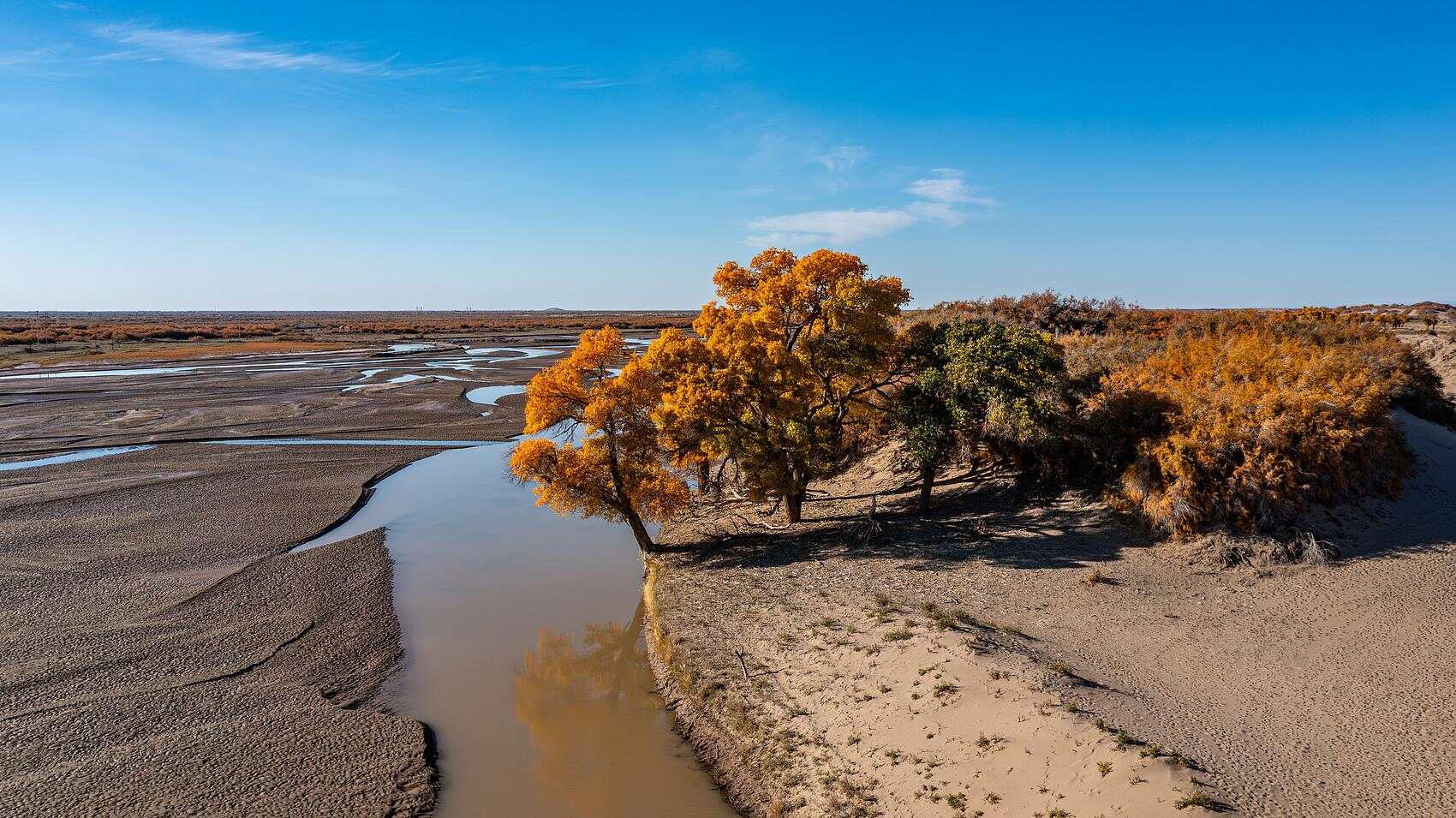 此时的额济纳旗晴朗少云,巨大的昼夜温差有利于胡杨叶片合成花青素,因此,额济纳旗的秋色饱和度极高,金黄纯粹。