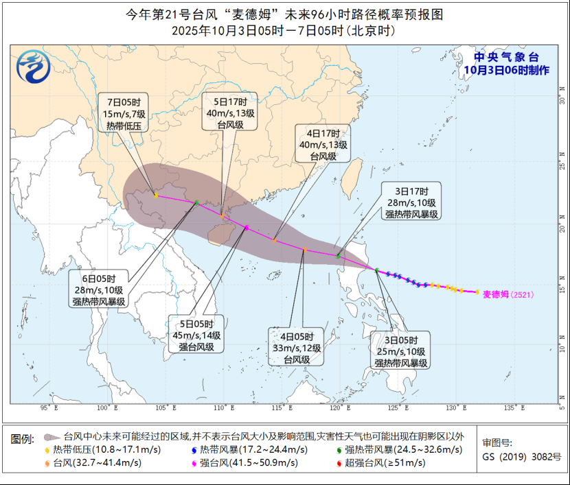 广东气象部门预计,10月3日-4日白天,广东省大部晴到多云;4日夜间-5日夜间,“麦德姆”给珠江口以西沿海市县和海面带来严重风雨影响;6日-8日,广东大部多云,部分市县有(雷)阵雨。