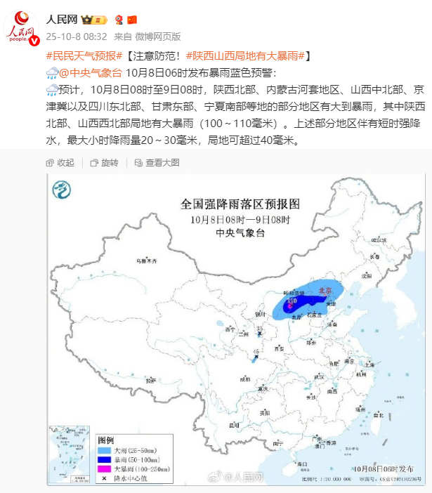 预计,10月8日08时至9日08时,陕西北部、内蒙古河套地区、山西中北部、京津冀以及四川东北部、甘肃东部、宁夏南部等地的部分地区有大到暴雨,其中陕西北部、山西西北部局地有大暴雨(100~110毫米)。上述部分地区伴有短时强降水,最大小时降雨量20~30毫米,局地可超过40毫米。