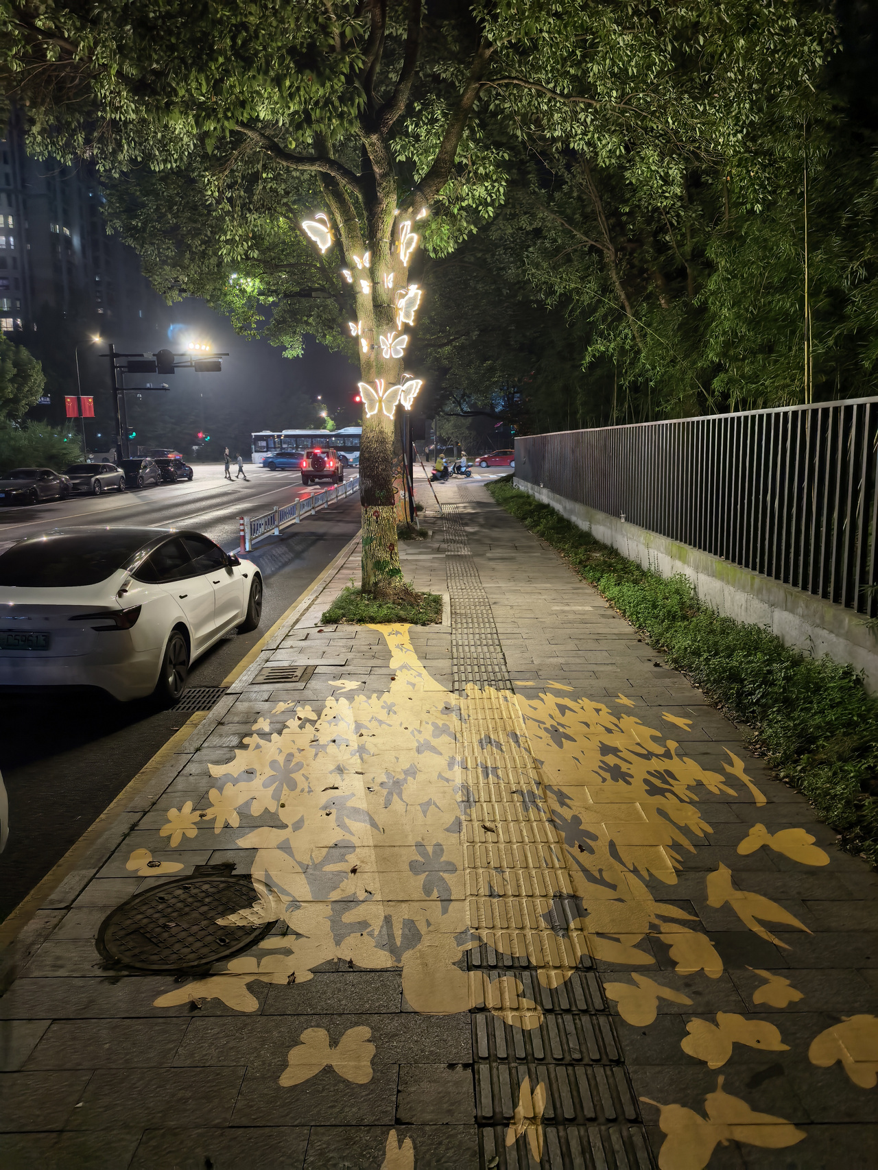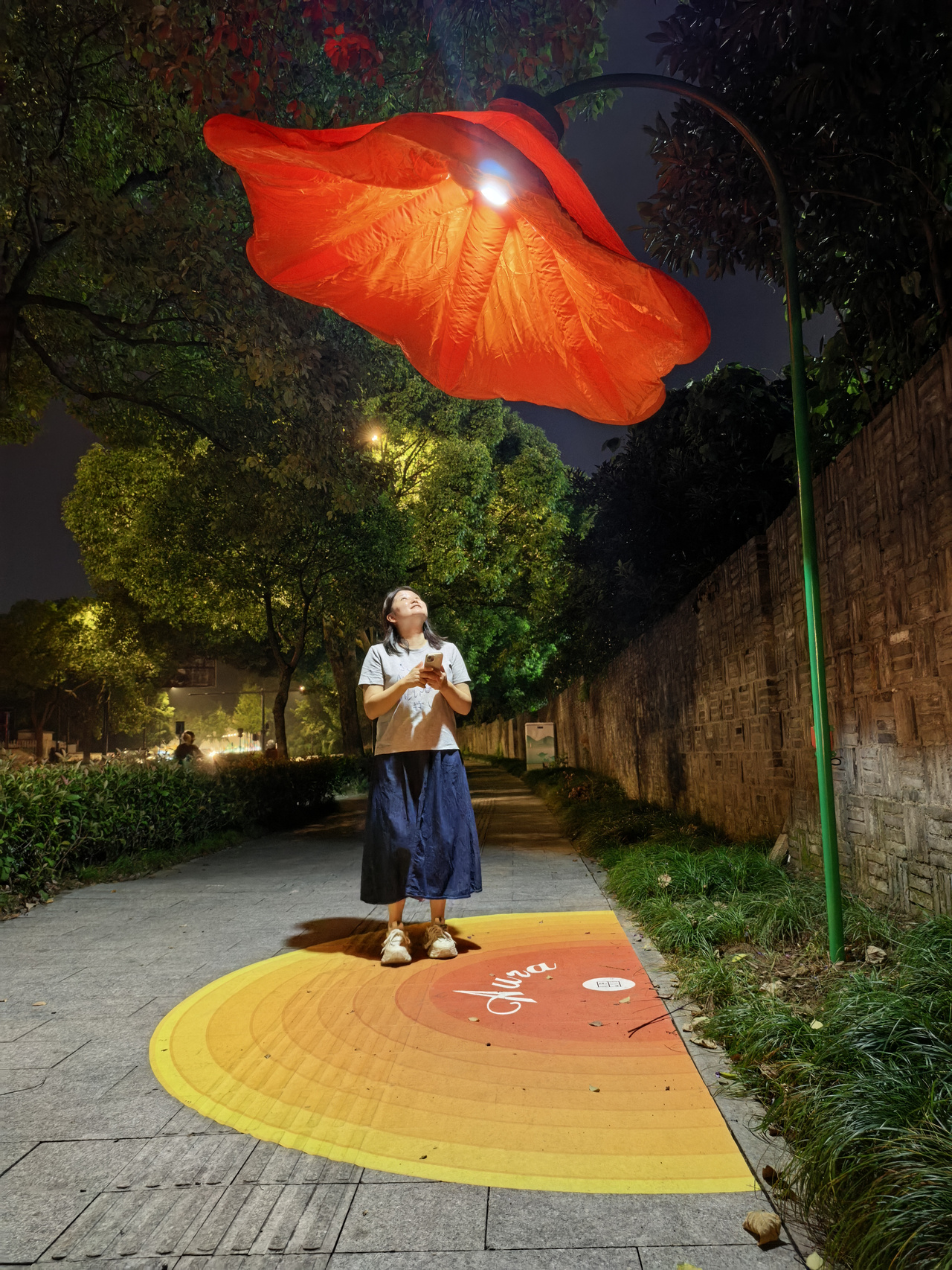 其余三棵树也各具巧思:《fafa,想开了》采用编织与悬挂结构,呈现花朵绽放的瞬间;《因你而开》是件沉浸式光影艺术装置,路人经过时,感应装置会触发花朵层层展开的动态瞬间;《蝶影共生》通过蝶与树的虚实对话,构建出多维度的诗意场景。