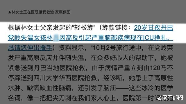 当然具体到她这个事儿,我觉得两方面说,一个是这个事情比较特殊,高反女孩不是在日常生活中遭遇意外,而是在参与高海拔登山这个过程中出现的意外,咱们姑且不讨论搭子的责任问题,这个女孩自身肯定是有较大注意义务的,那很多人就会觉得你是玩去了,而且你去玩之前自己没做好功课,凭什么出了事儿就找网友捐款?
