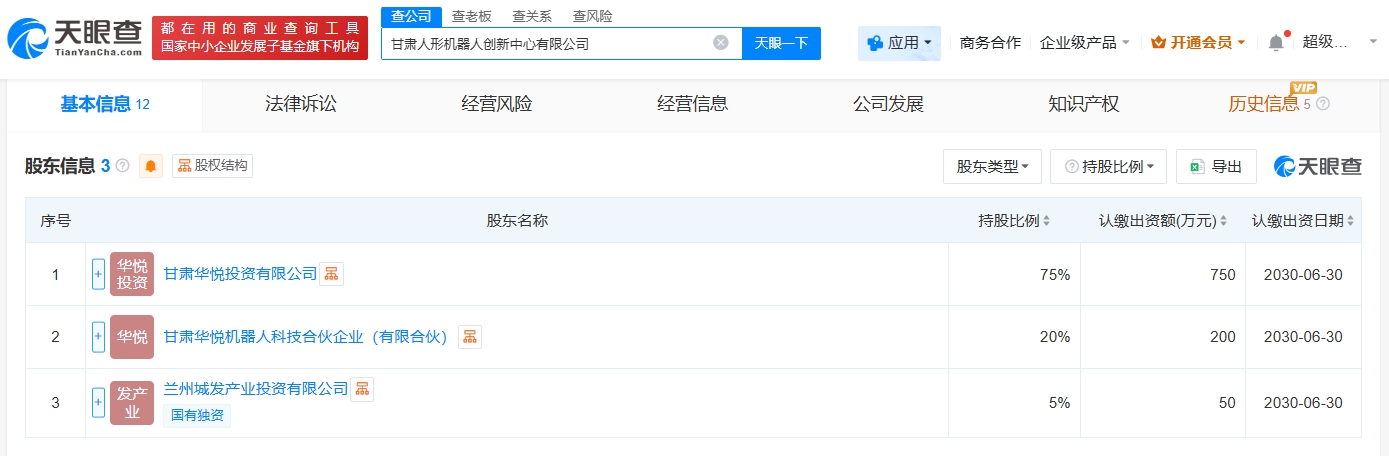 每经AI快讯,天眼查App显示,近日,甘肃人形机器人创新中心有限公司成立,法定代表人为贾乐,注册资本1000万元人民币,经营范围包括工业自动控制系统装置制造、智能机器人的研发、智能机器人销售等。股东信息显示,该公司由甘肃华悦投资有限公司、甘肃华悦机器人科技合伙企业(有限合伙)、兰州城发产业投资有限公司共同持股。