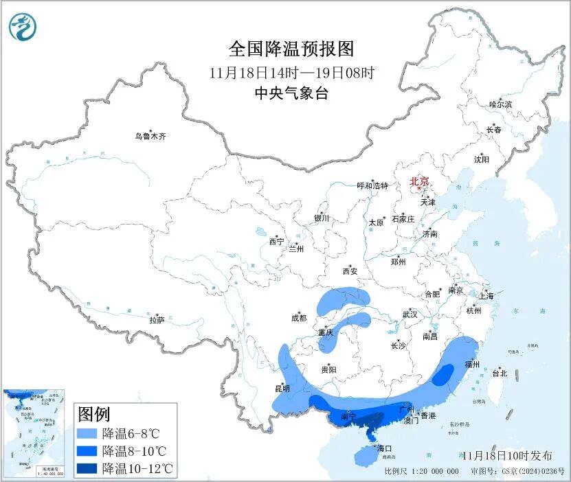 中央气象台11月18日10时继续发布寒潮蓝色预警:受强冷空气影响,预计,11月18日14时至19日08时,四川东部和南部、重庆、江西东部和南部、浙江南部、福建、广东东部和中南部、广西中南部、云南东部、海南岛等地有6~8℃降温,其中,广西南部、广东西南部等地的部分地区降温可达10℃以上。19日凌晨,最低温度0℃线将南压到苏皖南部至湖北中部一带。