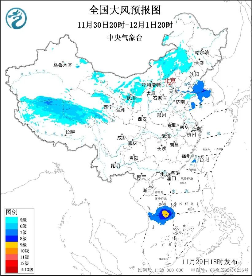 预计,11月29日20时至30日20时,新疆东部、内蒙古中西部、西北地区东部、华北北部、西藏北部等地部分地区将有5至7级风、阵风8至9级。渤海、渤海海峡、黄海北部和中部海域将有7至8级、阵风9至10级的大风,南海中西部和西南部海域将有7至8级、阵风9级的旋转风,局部海域风力可达9至10级、阵风11至12级。