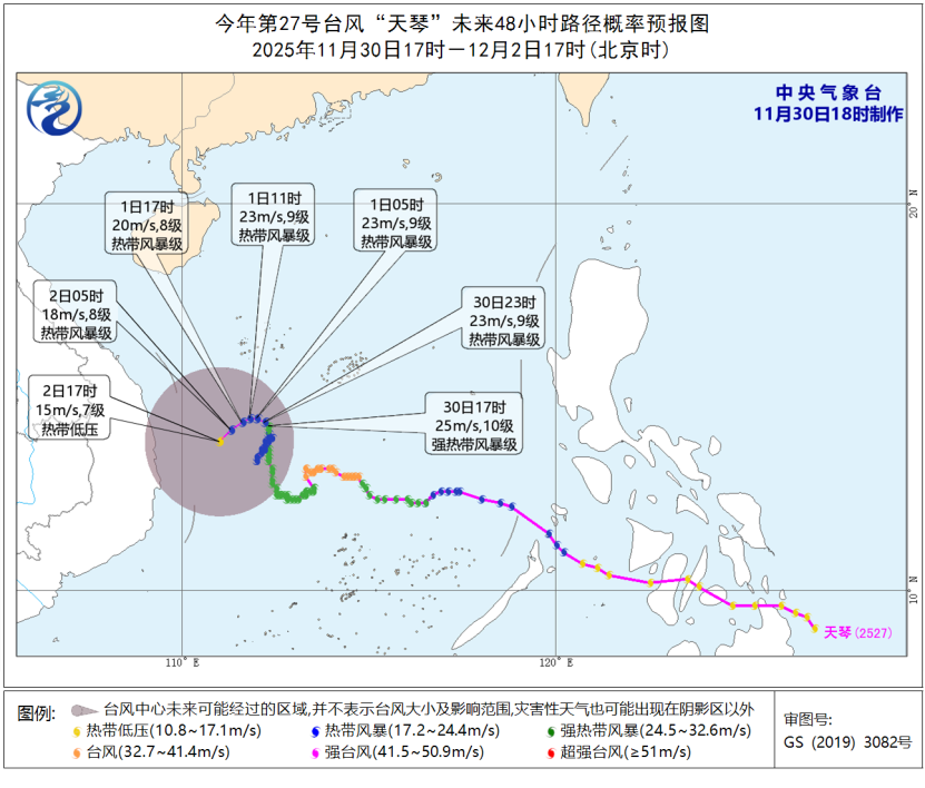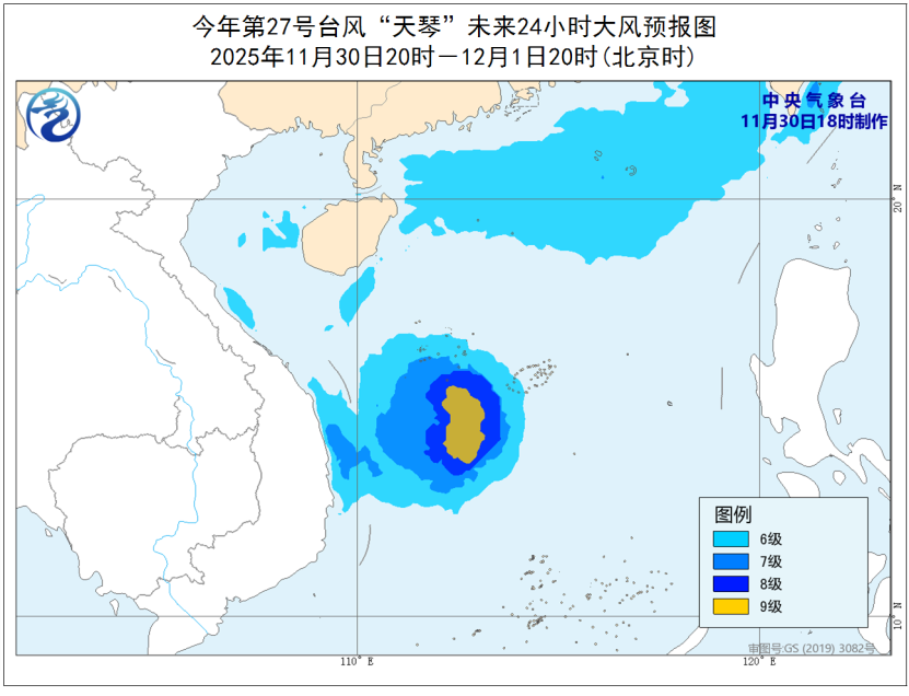 大风预报:11月30日20时至12月1日20时,受“天琴”和冷空气的共同影响,南海西南部和北部及东沙群岛、西沙群岛、中沙群岛将有6级、阵风7级风,其中,“天琴”中心经过的附近海域风力可达7~9级,阵风10~11级。