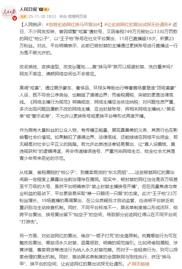 近日,不少网友反映,曾因频繁“炫富”遭封号、又因偷税749万元被处以1330万罚款的网红“柏公子”,以“王子柏”账号在社交平台复出,11月已直播超19次,积累23万粉丝。对此,平台明确表示,此前已被封禁的主播通过更换账号进行直播这一行为是不被允许的。