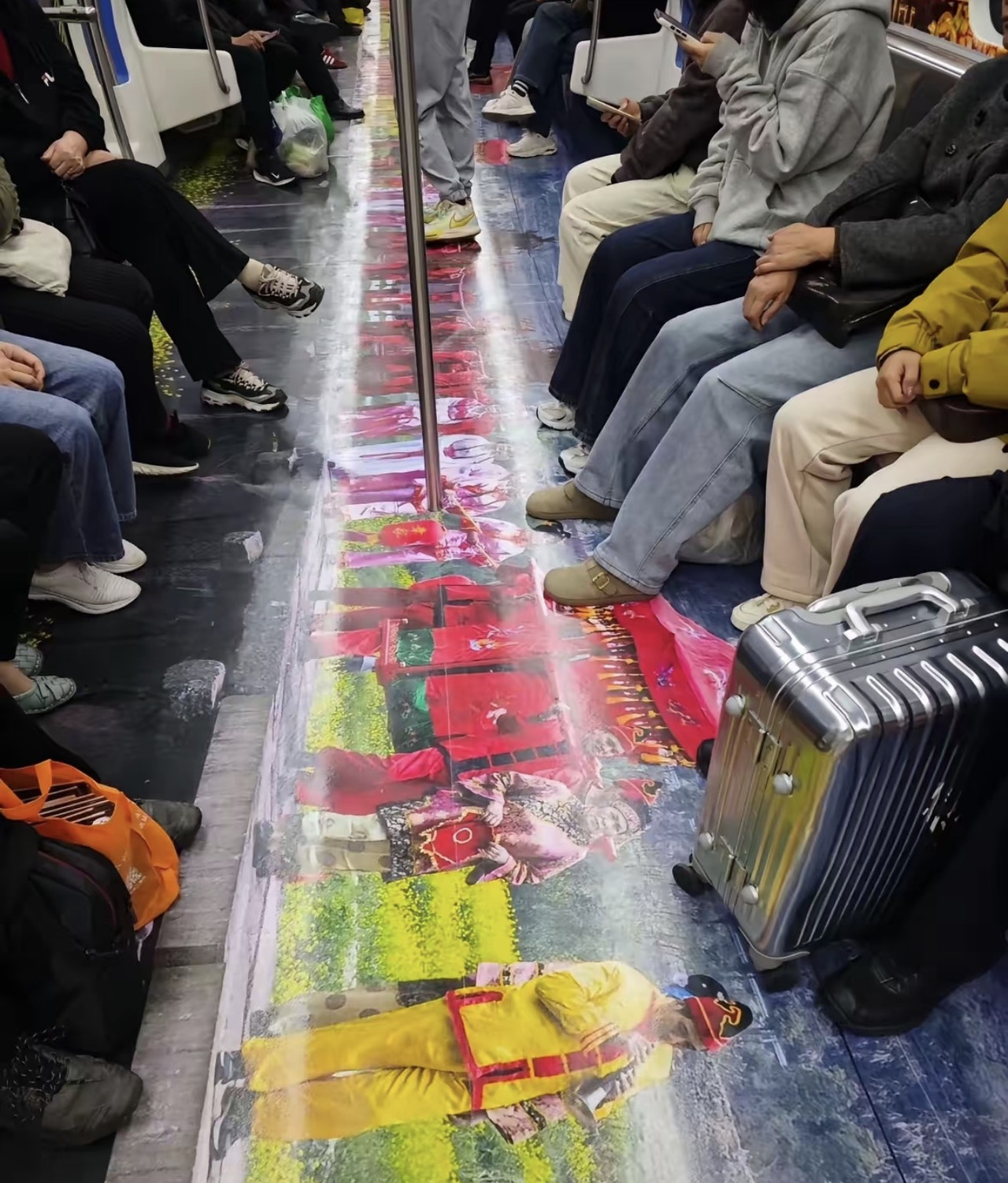 据社交平台网友们分享的图片显示,车厢地板上铺印了鲜艳的疑似迎亲队伍图案,也没有注释广告想要表达的具体内容。