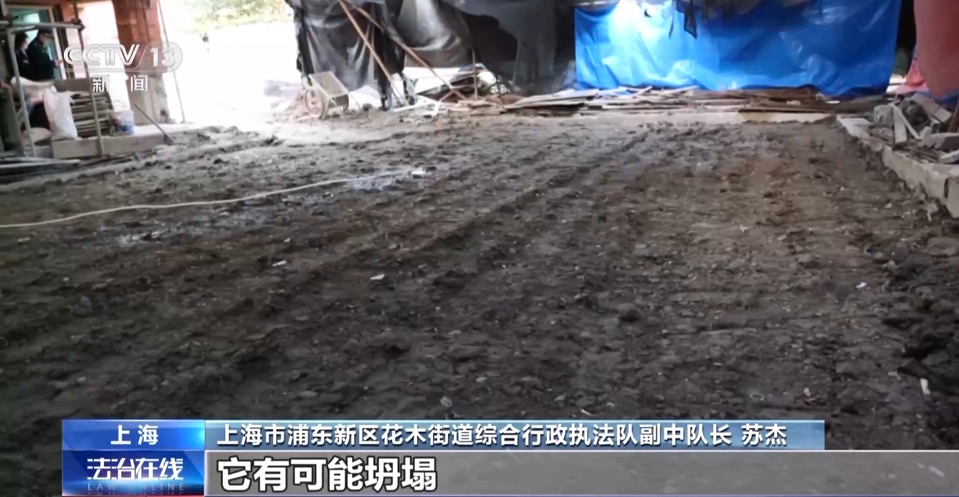 上海市浦东新区花木街道综合行政执法队副中队长苏杰:第一,是防止他继续进行涉嫌的违法建设行为;第二,本来它下边是有挡土墙的,如果挡土墙发生弯曲变形,它这上面地面就会沉降,它有可能坍塌,所以就先回填,把应急措施先做了,接下来也是督促他尽快找专业机构。