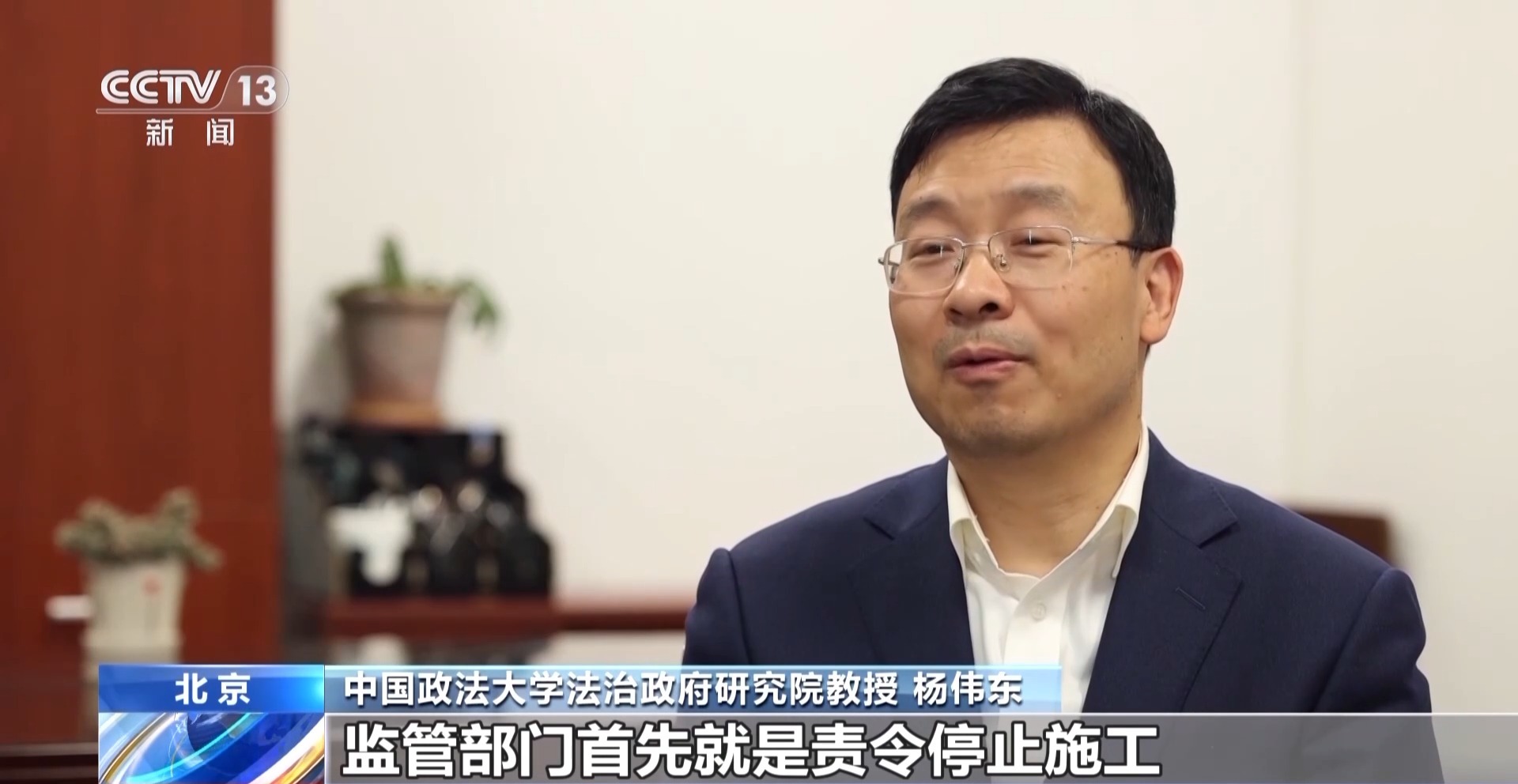 中国政法大学法治政府研究院教授杨伟东:监管部门首先就是责令停止施工,再接着如果发现压根是没证进行施工的,那就要责令限期改正,一旦认定他是违规违法的,非常重要的必须是书面的方式,要发出一个正式的通告通知。如果再不行,我们就要有更重要的强制执行的手段。