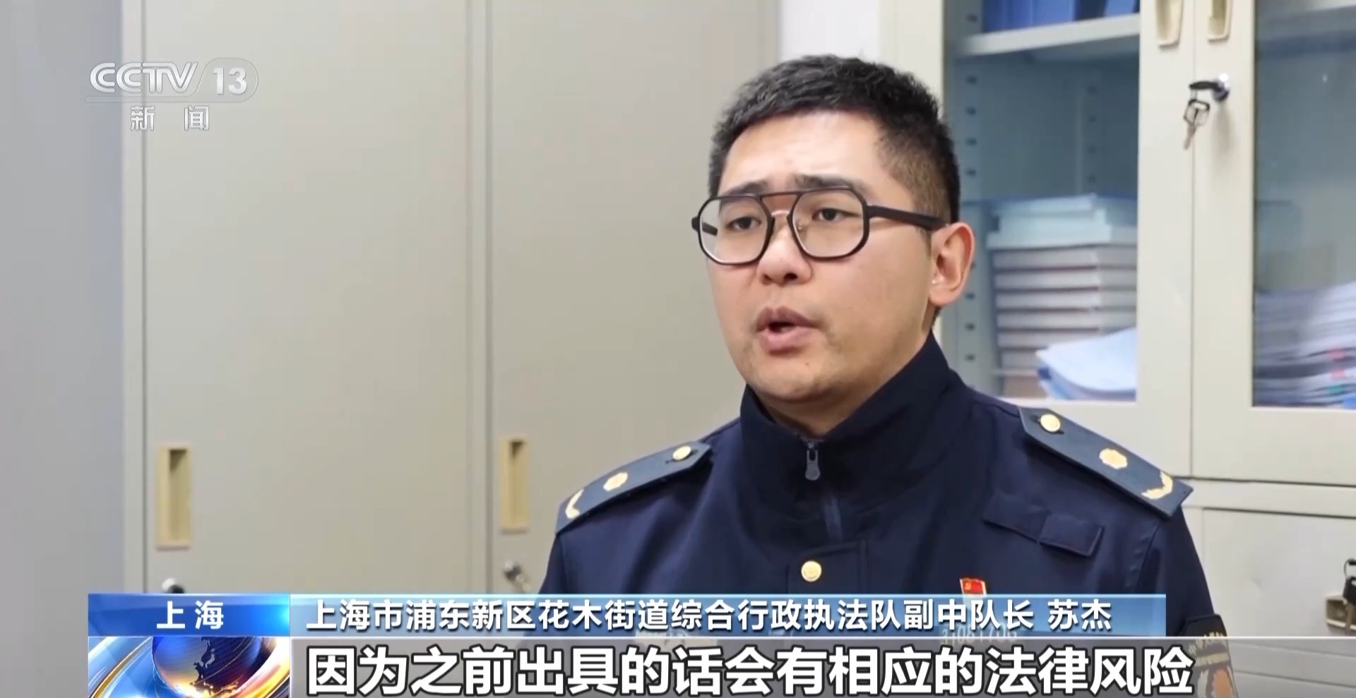 上海市浦东新区花木街道综合行政执法队副中队长苏杰:是口头上要求他进行整改,是有法律效力的。在我们立案以后,可以出具相应的法律文书,因为之前出具的话会有相应的法律风险,比如当事人会提起行政复议,如果是案件事实调查不清楚的话,我们会有行政复议,被判违法或者行政败诉的风险。