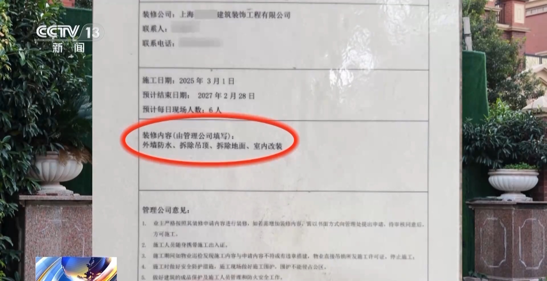 2025年2月,小区的物业公司给刘先生代理这家开出了施工许可证,其中报备的装修内容是:外墙防水、拆除吊顶、拆除地面、室内改装。施工日期为2025年3月1日—2027年2月28日。