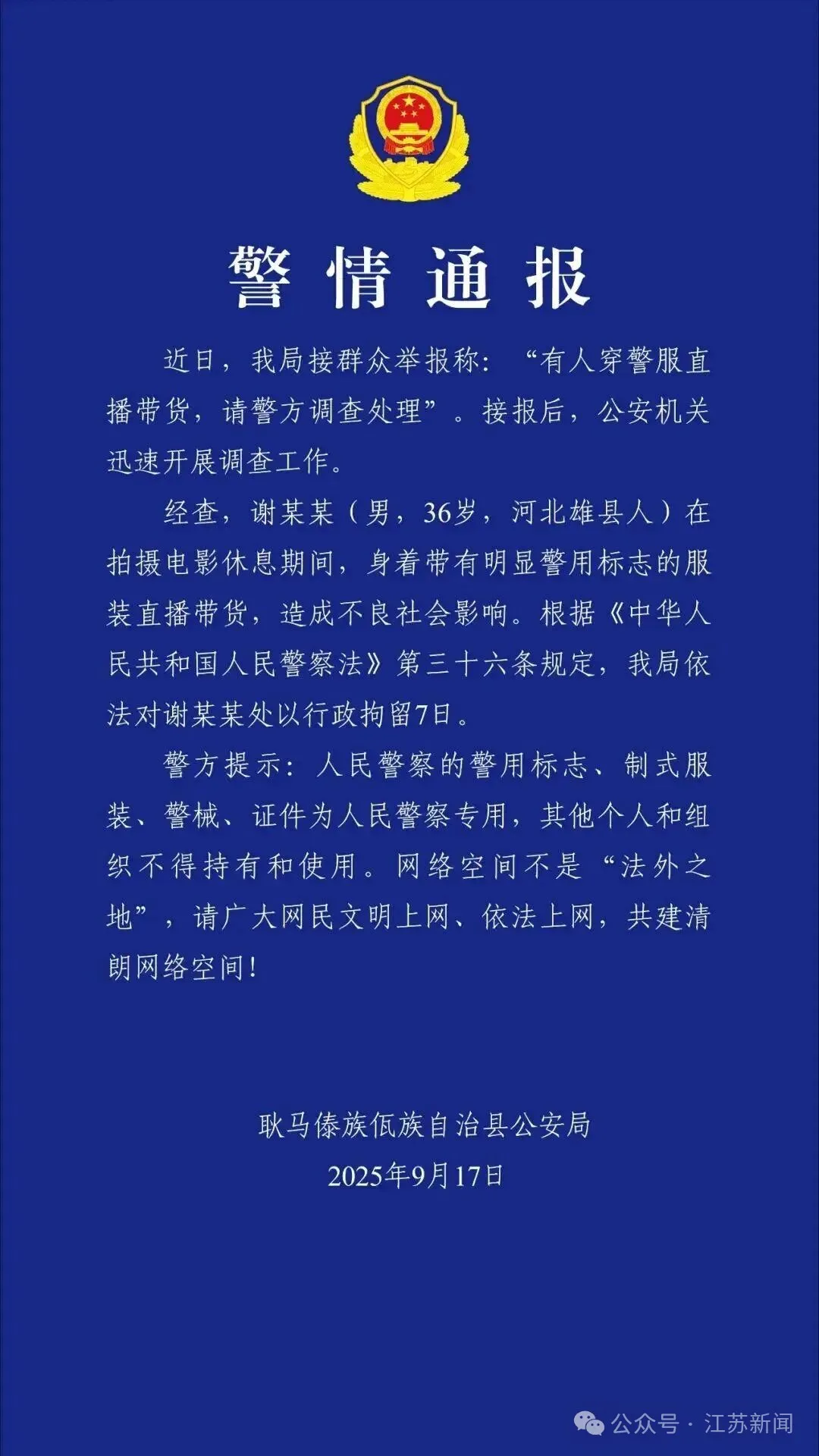 9月17日,云南警方发布警情通报,称“嘎子哥”演员谢某某(男,36岁,河北雄县人)在拍摄电影休息期间,身着带有明显警用标志的服装直播带货,造成不良社会影响,决定对其行政拘留7日。