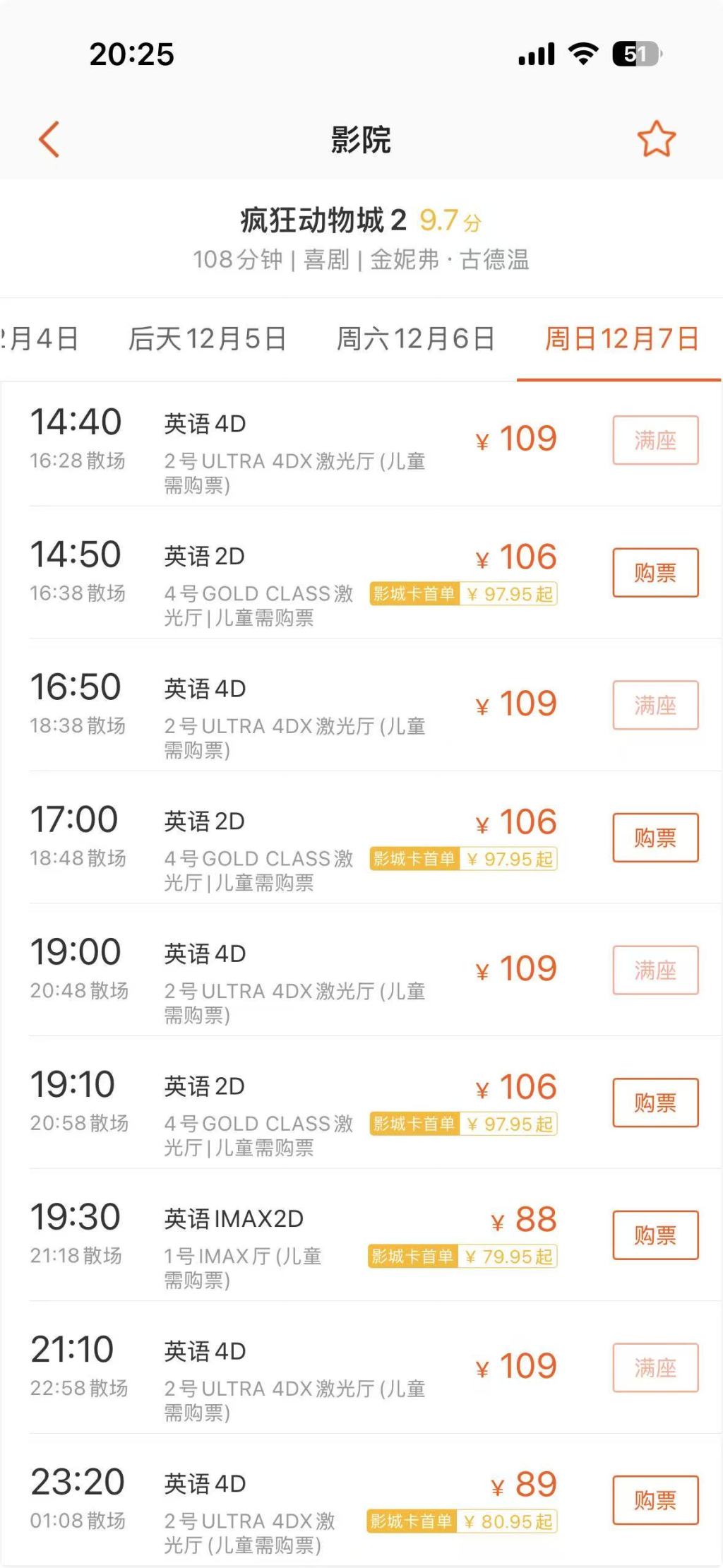 在第三方票务平台,CGV影城(白玉兰广场IMAX店)和CGV影城(晶耀前滩杜比ULTRA4DX店)的《疯狂动物城2》英语4D场次标价均为110元左右。截至12月3日晚,CGV影城(晶耀前滩杜比ULTRA4DX店)12月4日在售4D场次仅剩8:50场次可购票,当天另6场4D场次均显示满座。目前该影片可售票的12月5日、6日、7日全天所有4D场次均已满座。