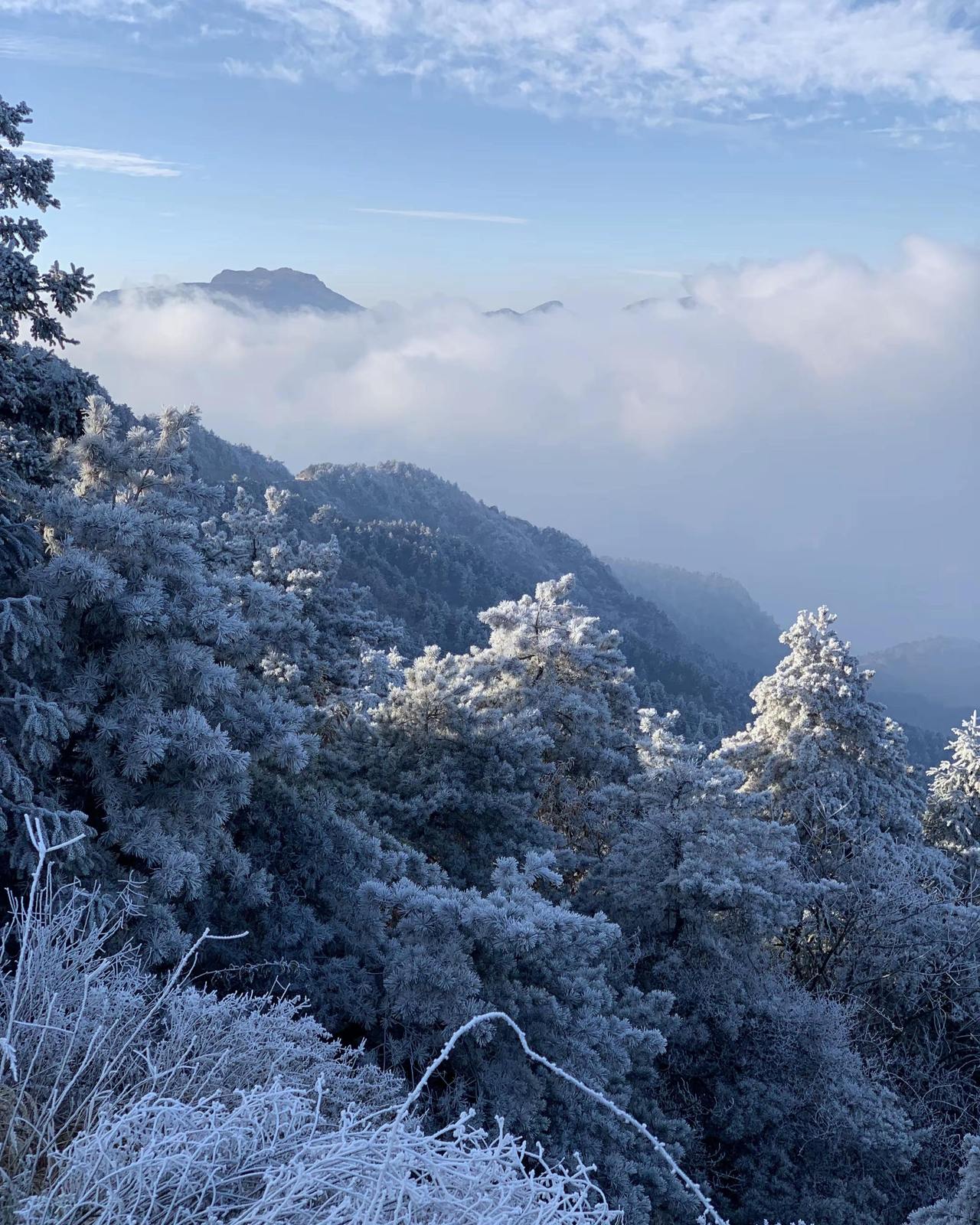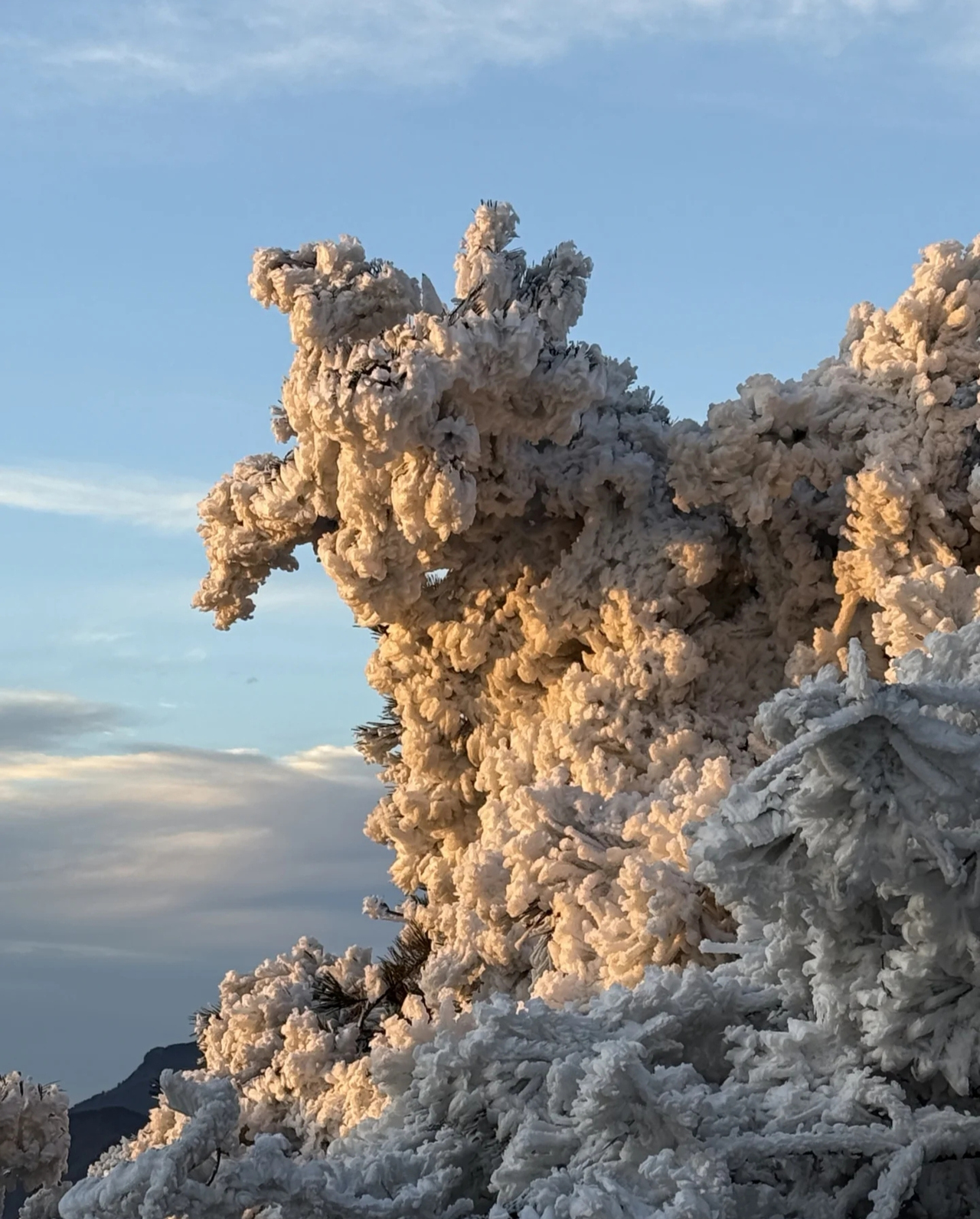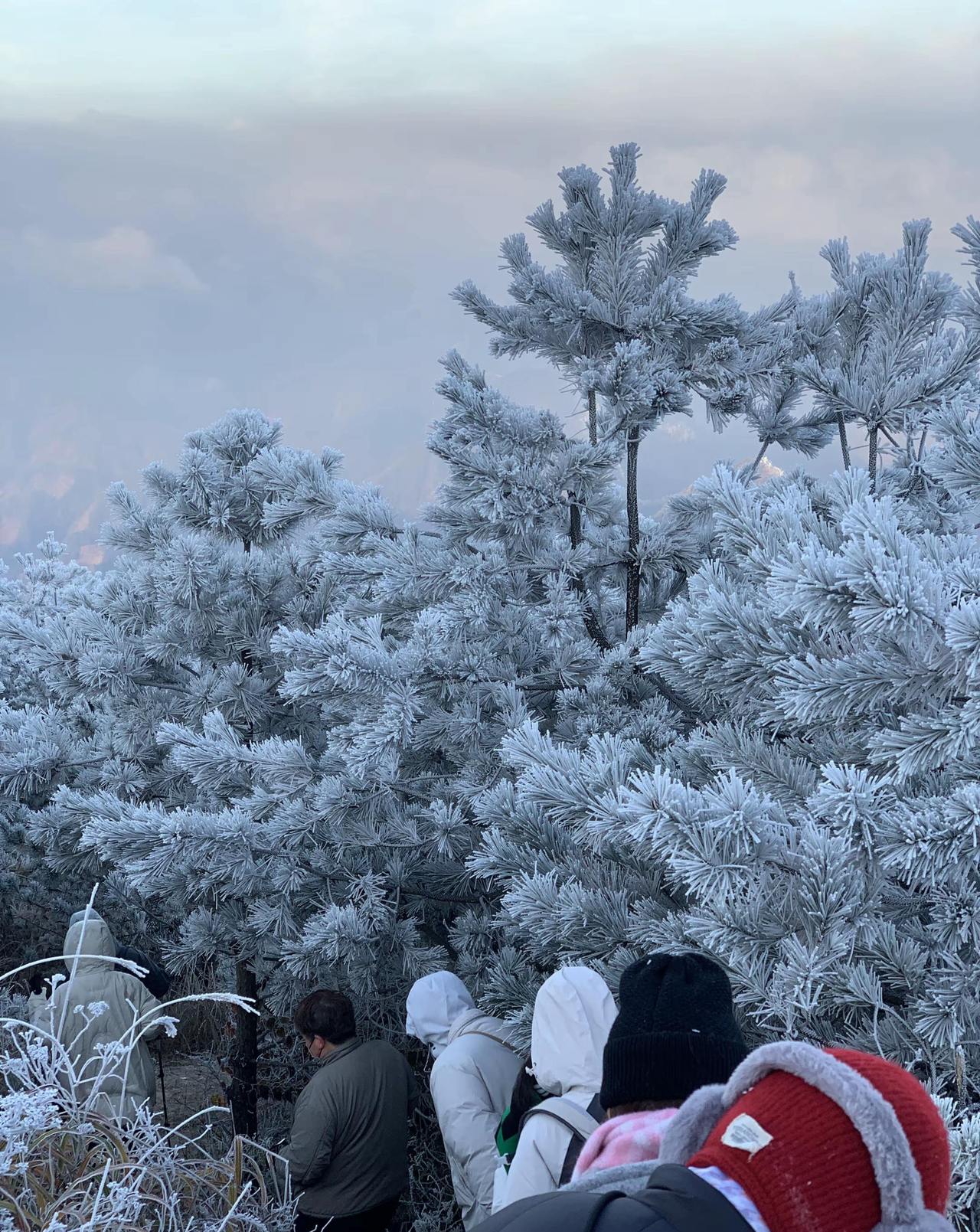 雾凇一般分为两种:气温低于-15℃、有雾微风时形成的“晶状雾凇”,结构松散,多见于北方;而气温在-2℃至-7℃、有浓雾且风速较大时,则易形成“粒状雾凇”,形如粒粒冰珠,太子尖所见多属此类。