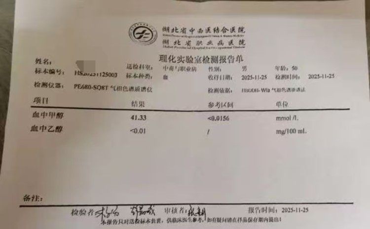 李某某血中甲醇含量为41.33mmol/L。图片来源/受访者供图