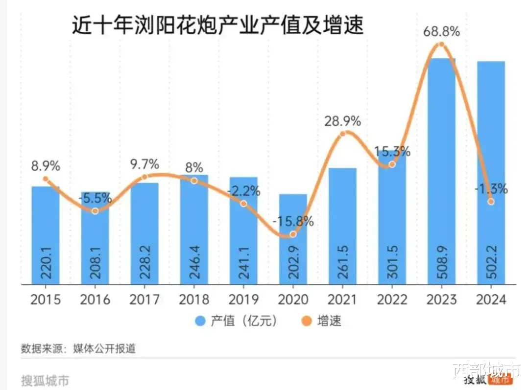 而在2023年,全国多地迎来新一轮烟火爆竹解禁,浏阳的烟火爆竹产业也随之大幅反弹:2023年,浏阳市鞭炮烟花产业全年实现总产值508.9亿元,同比增长高达68.8%。