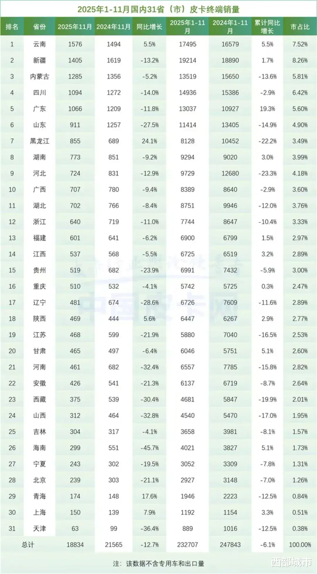 先是云南在道路交通安全管理工作专题新闻发布会上宣布,全省16.88万辆皮卡车(多用途货车)正式获得与小型载客汽车同等的城市道路通行权,标志着皮卡进城限制在云南全面放开。