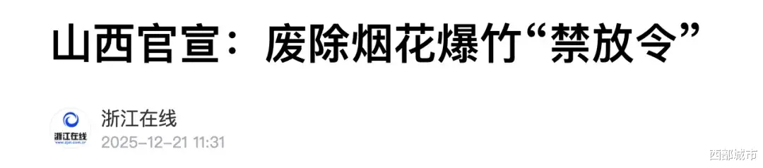 这意味着山西省级层面关于烟火爆竹的一刀切“禁令”被废除。虽然这并不代表烟花爆竹在山西全域可完全“自由”燃放,但统一禁令的废止,至少是一个明显的政策松绑信号。