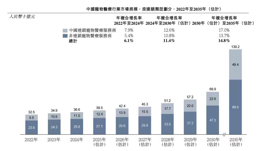 从行业前景来看,根据灼识咨询的数据,国内连锁宠物医疗服务市场规模在2024年已达110亿元,预计2030年将增长至226亿元,期间CAGR约12.6%;到2035年,行业规模将再次翻倍至494亿元,期间CAGR小幅加速至17%。