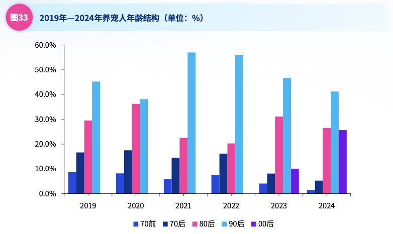 再看国内养宠人士的年龄结构,90后与00后的合计占据68%的市场份额,是宠物消费市场的主导力量。但这两个年龄段大多处于事业起步阶段,收入水平相对有限,可支配资金并不充裕。他们虽养宠意愿强烈,但面对宠物医疗这类相对高客单价支出时,消费决策会更加审慎,价格敏感度较高,因此进一步抑制了宠物医疗市场的需求释放。