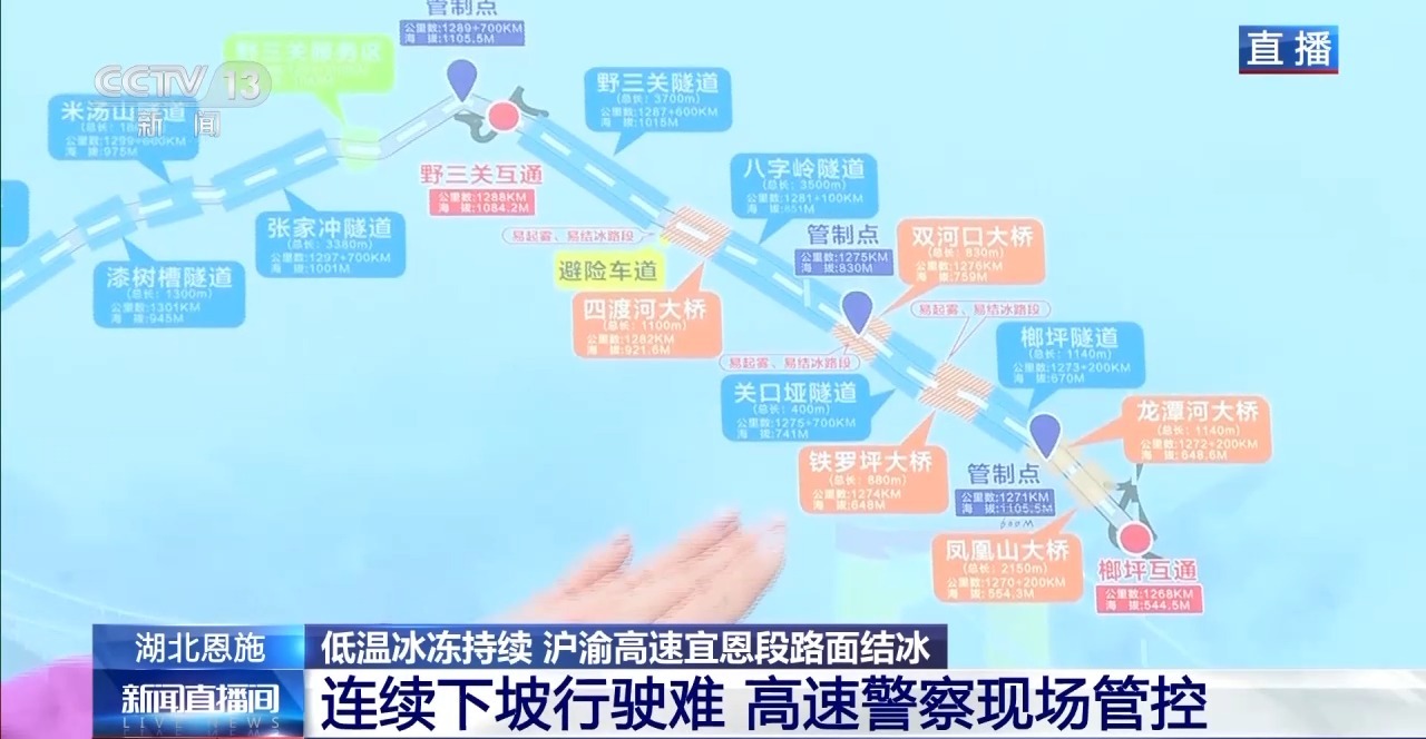 沪渝高速是我国连接东西方向的大动脉,常年车流量非常大,尤其是大货车居多。沪渝高速宜恩段这一段地处山区,桥隧比超过了60%。因此,这个区域一旦出现冰冻雨雪天气,桥面的积雪遇到山中的大风,就非常容易结冰,对车辆行驶带来安全隐患。
