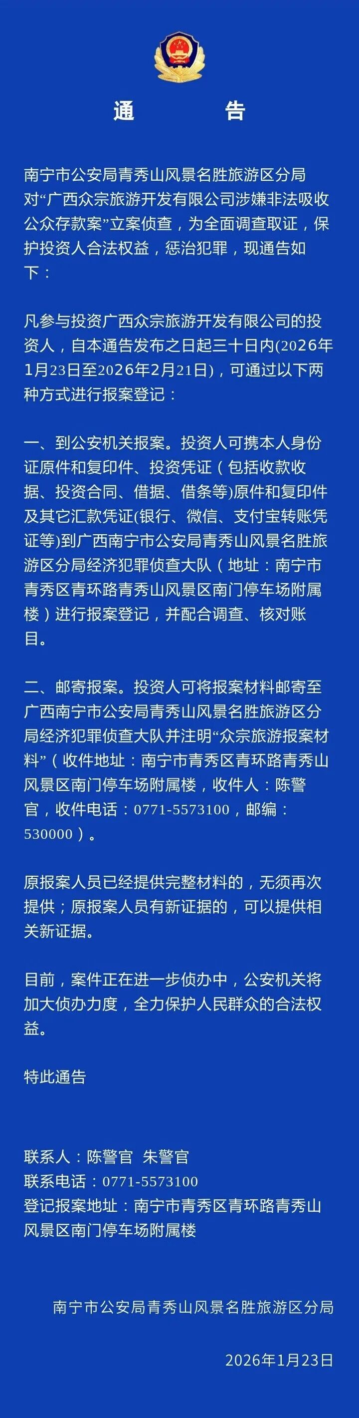 广西一公司涉嫌非法吸收公众存款,警方发布通告 作者: • 更新时间:2026-01-24 02:00 • 1月23日,南宁青秀山警方发布关于接收广西众宗旅游开发有限公司涉嫌非法吸收公众存款案案件材料的通告:来源丨青秀山警方 本文内容由互联网用户自发贡献,该文观点仅代表作者本人。如发现本站有涉嫌抄袭侵权/违法违规的内容,请发送邮件至 203304862@qq.com 本文链接:https://www.jinnalai.com/jingyan/804312.html
