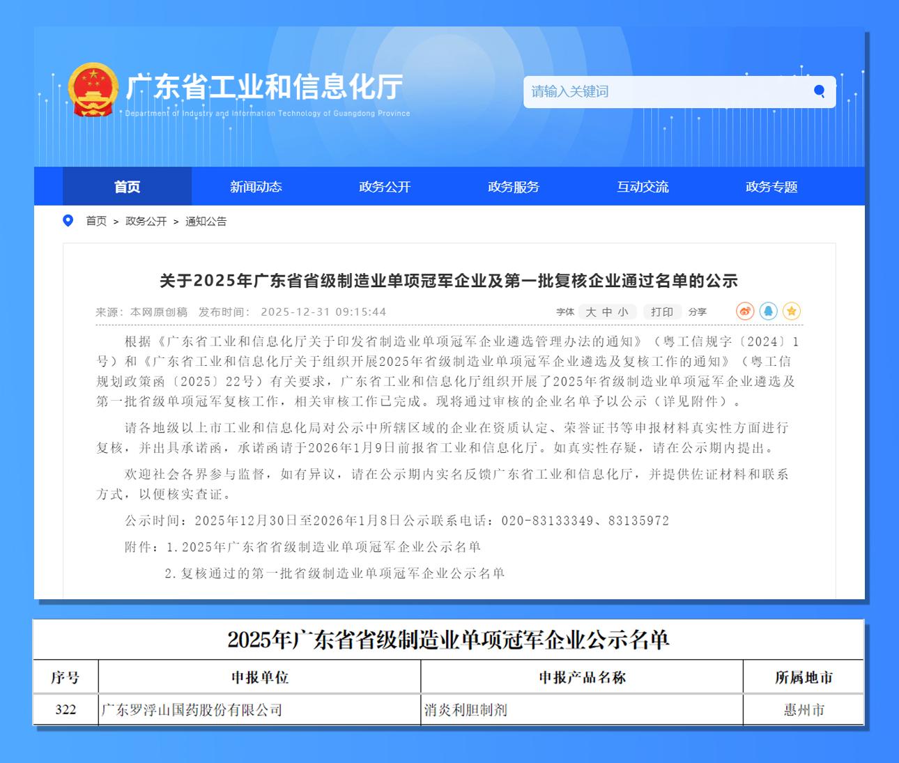 近日,广东省工业和信息化厅正式公布了2025年广东省省级制造业单项冠军企业名单。广东罗浮山国药股份有限公司(以下简称“罗浮山国药”)凭借核心产品系列——消炎利胆制剂,成为本次为数不多荣膺广东省省级制造业单项冠军的中医药企业。这标志着罗浮山国药在该细分领域的技术实力与制造水平获得了官方权威认可,成为中医药制造业高质量发展的又一标杆。