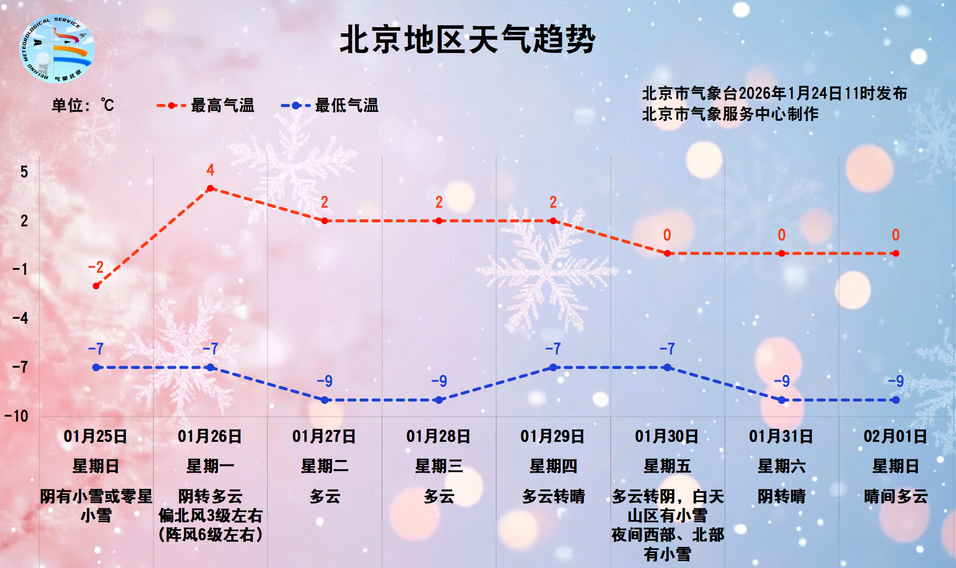 雪后,26日白天北风加大,阵风6级左右,风寒效应显著,建议大家外出要戴上帽子、手套等防寒装备,远离临时搭建物,同时注意用火用电安全。1月25日至2月1日白天最高气温-2℃至4℃,夜间最低气温-9℃至-7℃。