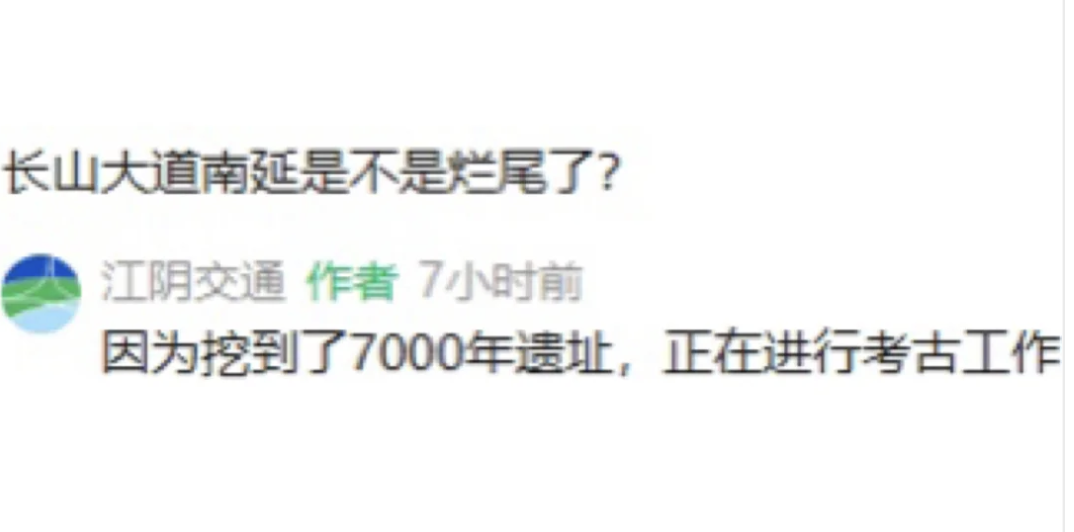近日,江苏无锡江阴市交通运输局公众号在回复网友评论时称,长山大道南延工程尚未推进,是因为“挖到了7000年遗址,正在进行考古工作”。该回复被网友截图转发后,引发关注。有网友对“7000年遗址”的说法产生好奇,纷纷询问这一情况是否属实。