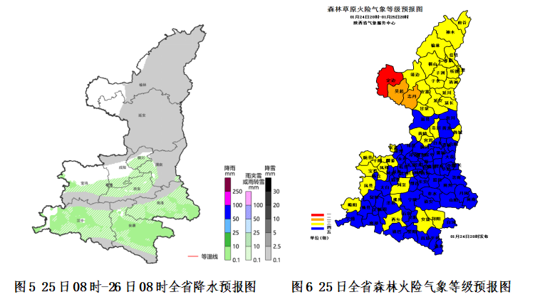 今天晚上:陕北、关中多云转晴天,陕南多云间阴天、南部局地有小雪或雨夹雪(0~1毫米)(图5)。今日陕北西部部分县区森林草原火险气象等级为1~2级(极高~高度危险)(图6),需注意防范。
