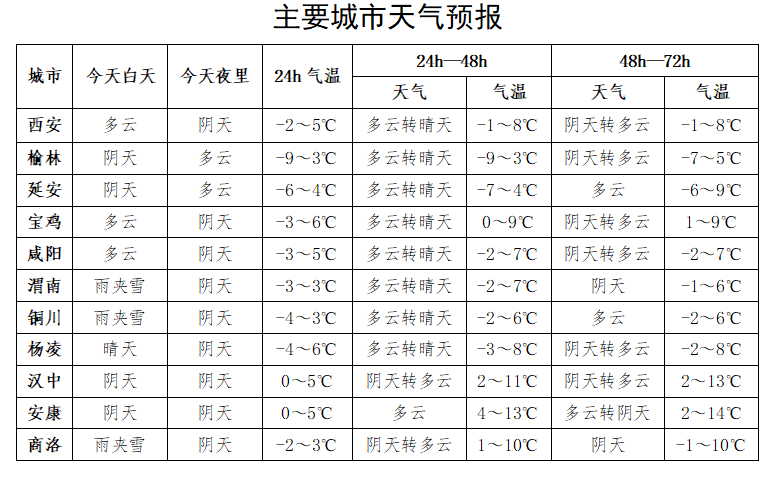 29日:全省阴天,陕北大部、关中北部和秦岭山区有小到中雪,关中南部、陕南有雨夹雪或小雪。