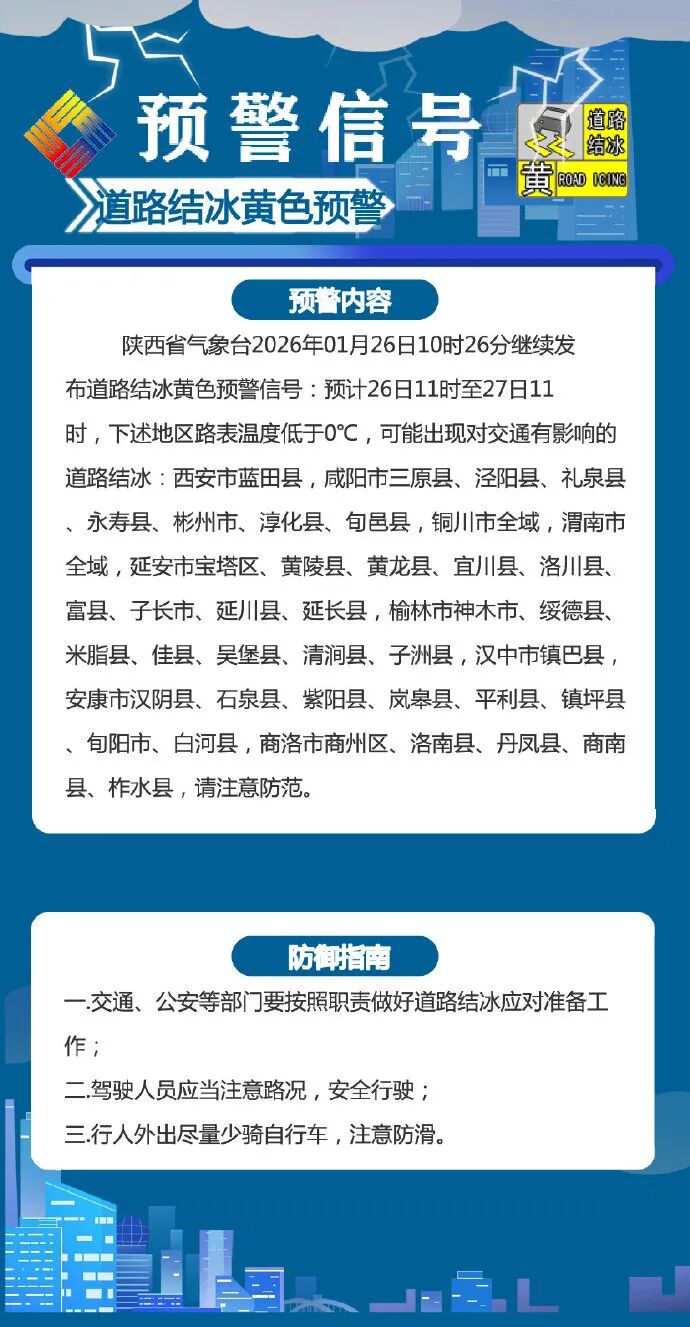 陕西省气象台2026年01月26日10时26分继续发布道路结冰黄色预警信号: