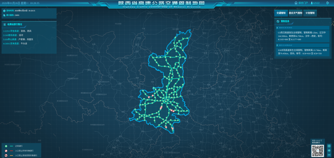 京昆高速西汉段秦岭服务区B区、林场交通安全管控点及朱雀立交西安方向临时管控,前往汉中方向的车辆由鄠邑东立交分流至西安外环高速通行;三星、鄠邑收费站入口汉中方向,涝峪收费站入口双向临时管控。