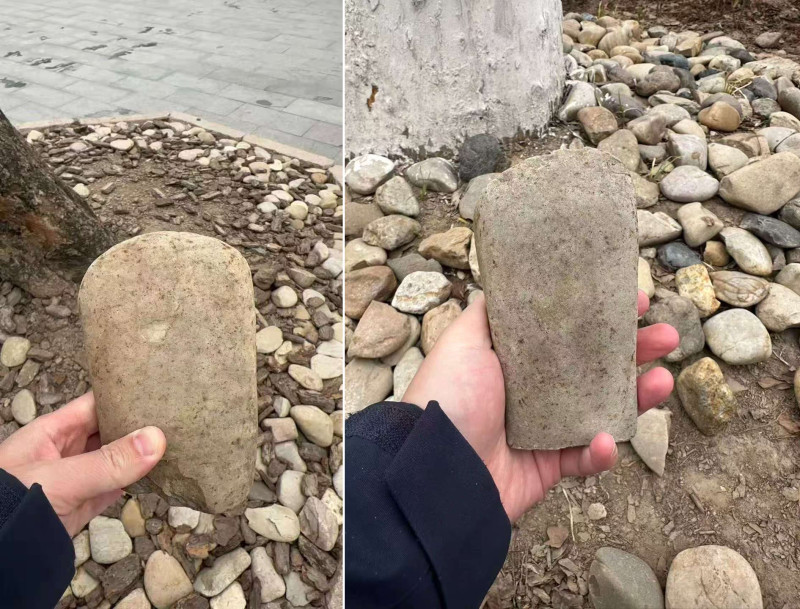 上海网友称,在和平公园花坛里捡到石块,形似新石器时代石斧。受访者供图
