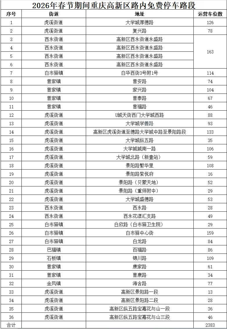 广大市民朋友请注意!为了方便市民春节假期出行,保障春节期间广大市民群众便捷停车,重庆高新区范围内所有路内停车位将在2026年春节期间免费开放。具体安排如下: