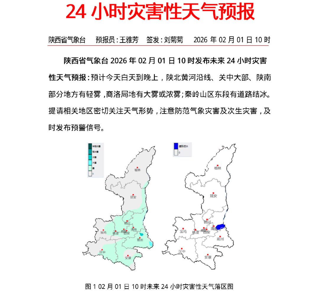 预计今天白天到晚上,陕北黄河沿线、关中大部、陕南部分地方有轻雾,商洛局地有大雾或浓雾;秦岭山区东段有道路结冰。