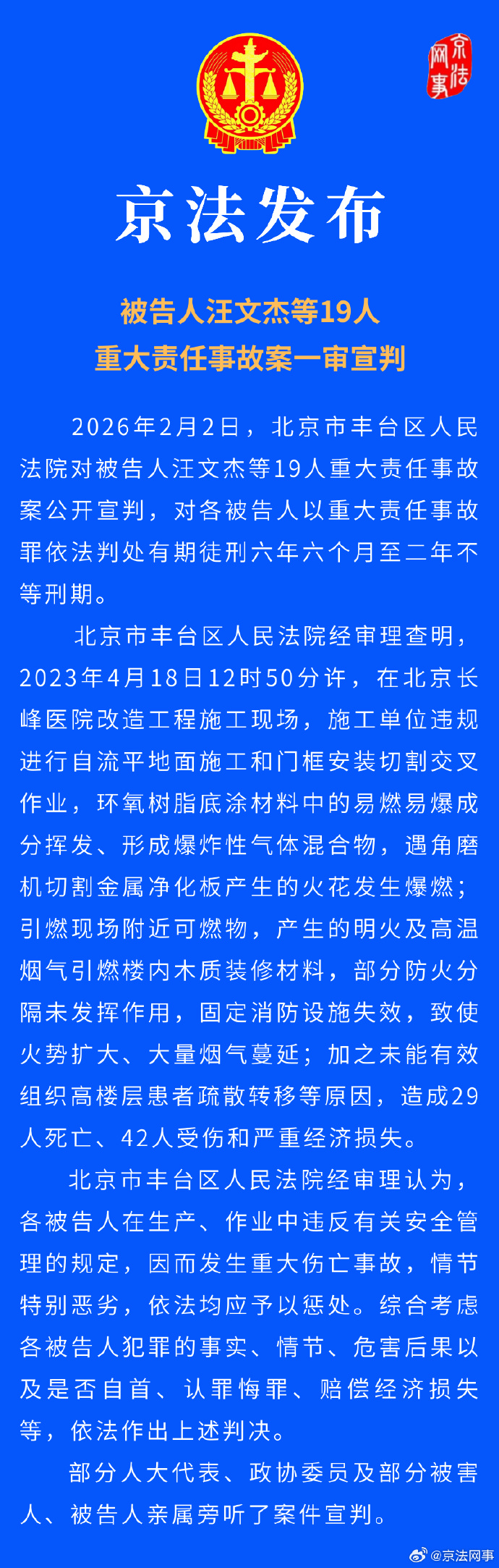 被告人汪文杰等19人重大责任事故案一审宣判 作者: • 更新时间:2026-02-02 18:00 • 新京报讯据京法网事消息,2026年2月2日,被告人汪文杰等19人重大责任事故案公开宣判,对各被告人以重大责任事故罪依法判处有期徒刑六年六个月至二年不等刑期。 本文内容由互联网用户自发贡献,该文观点仅代表作者本人。如发现本站有涉嫌抄袭侵权/违法违规的内容,请发送邮件至 203304862@qq.com 本文链接:https://www.jinnalai.com/jingyan/806401.html