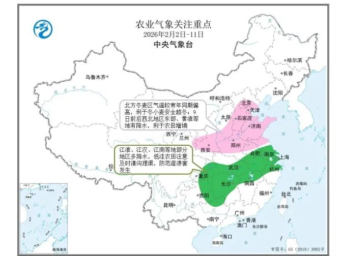 预计2月5到7日,受冷空气影响,中东部大部地区气温将自北向南下降4到8℃,其中东北地区东部和江南北部等地部分地区降温幅度可达10℃以上,降温过程将增加设施农业和畜牧业防寒保温成本,部分露地蔬菜、未采摘果实等可能遭受冻害。9日前后,西北地区东部、黄淮等地有雨夹雪或雪,利于农田保温增墒和冬小麦安全越冬。