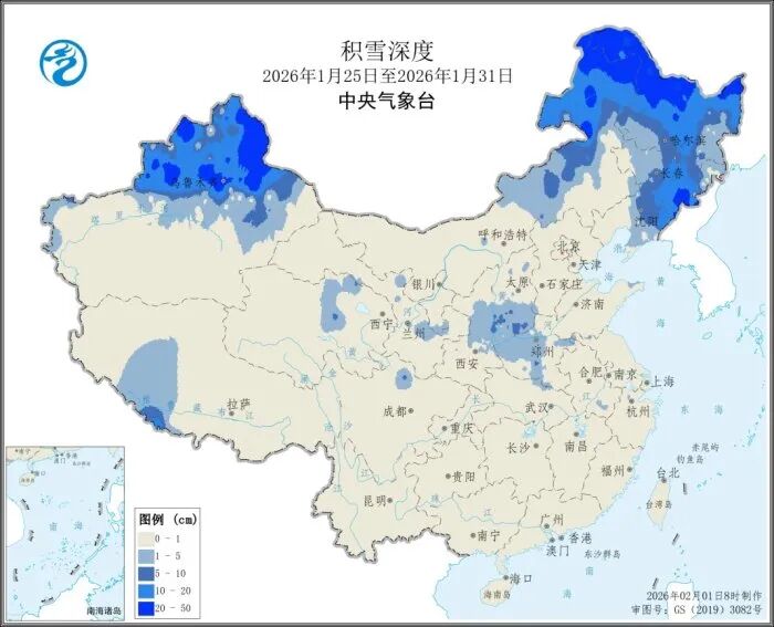 内蒙古东部、东北地区大部、新疆北部、山西南部、陕西中部、河南西部等地最大积雪深度为1到10厘米,部分地区为10到50厘米。