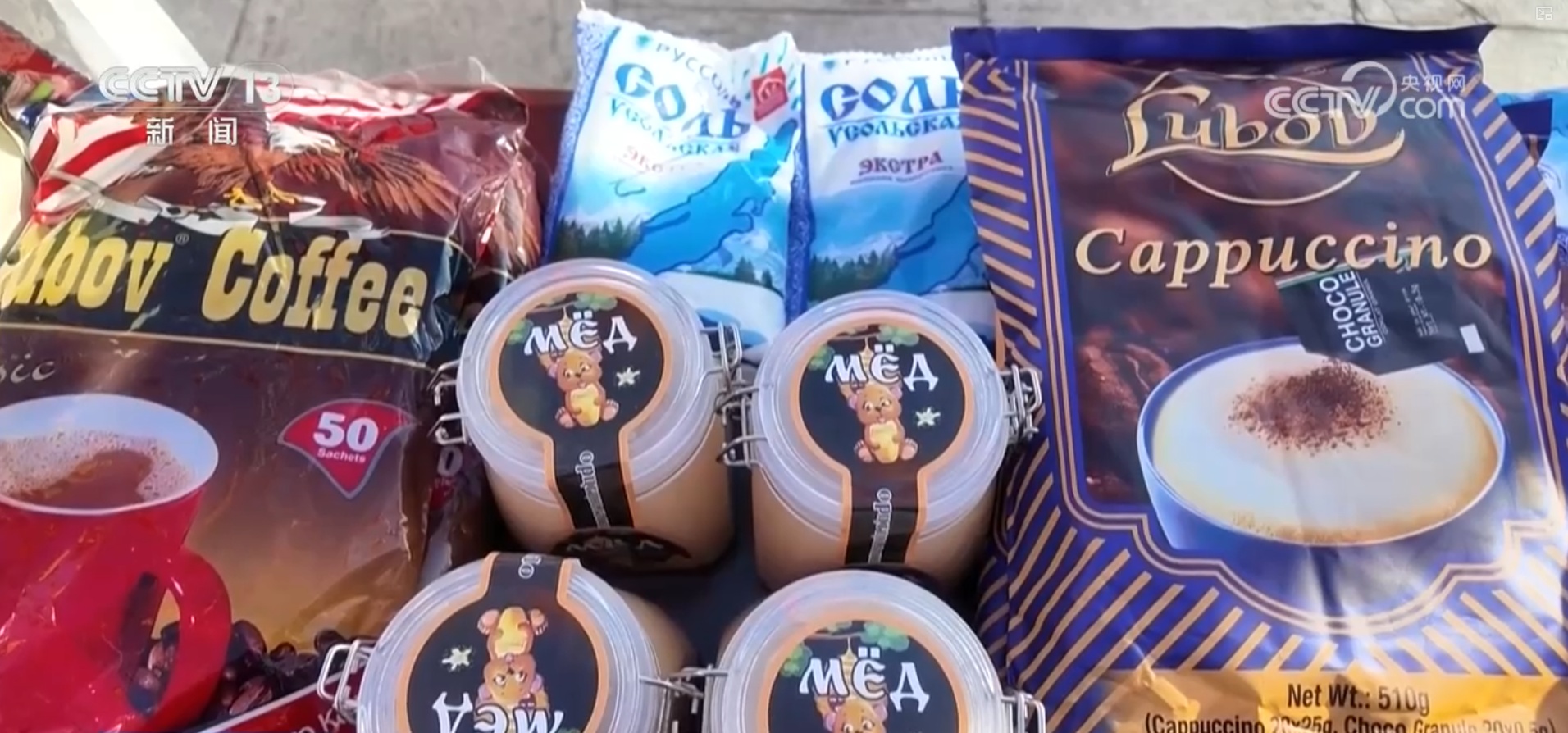 除了地道的东北年货,大集里还有俄罗斯糖果、咖啡等进口商品。商户们各显其能,来自全国各地的游客则尽情体验、选购,感受着别样的东北风情。