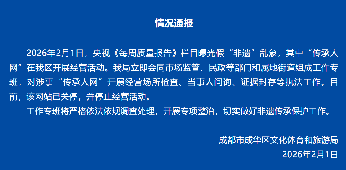 通报称,2026年2月1日,央视《每周质量报告》栏目曝光假“非遗”乱象,其中“传承人网”在成华区开展经营活动。该局立即会同市场监管、民政等部门和属地街道组成工作专班,对涉事“传承人网”开展经营场所检查、当事人问询、证据封存等执法工作。目前,该网站已关停,并停止经营活动。