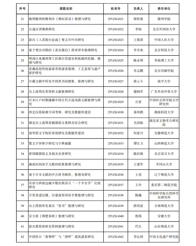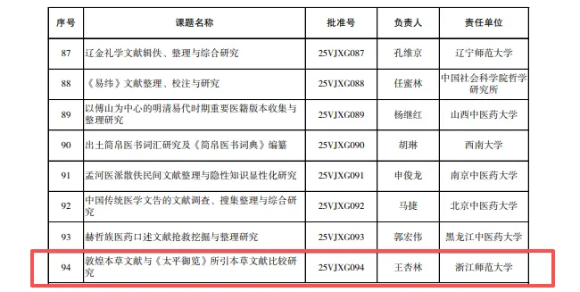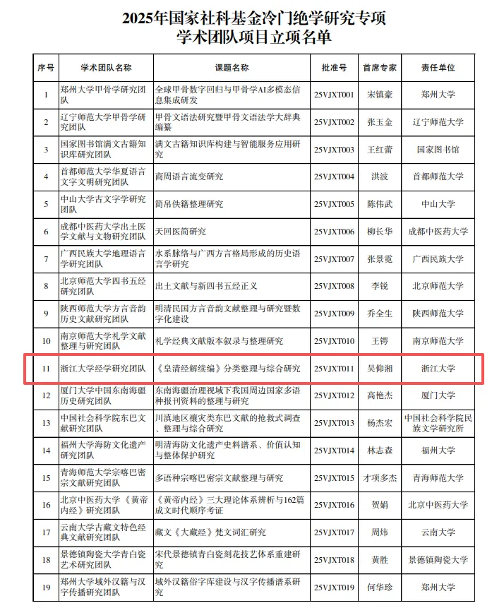 学术团队项目中,浙江大学经学研究团队的课题《<皇清经解续编>分类整理与综合研究》、中国美术学院上古图像体系研究团队的课题《中国上古图像体系的图法图式研究》入选。