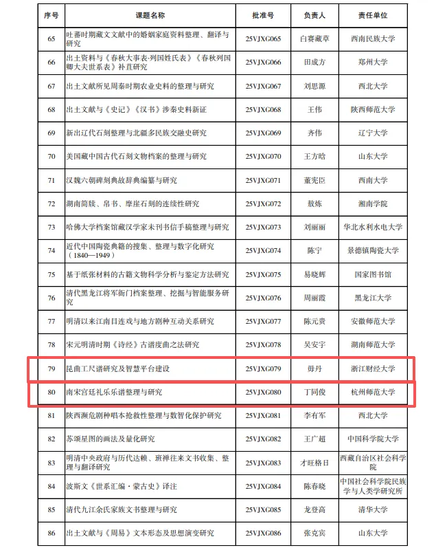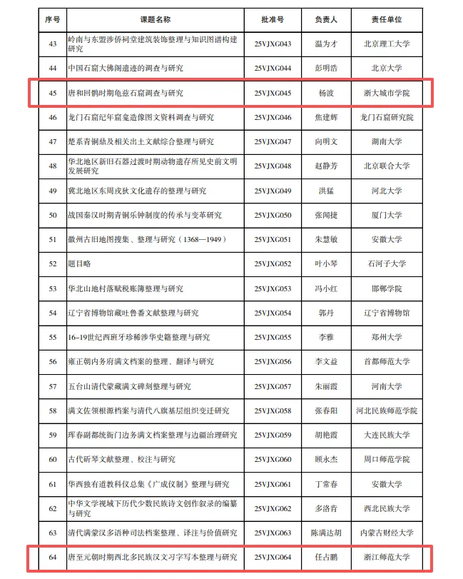 学者个人项目中,浙大城市学院杨波的课题《唐和回鹘时期龟兹石窟调查与研究》、浙江师范大学任占鹏的课题《唐至元朝时期西北多民族汉文习字写本整理与研究》、浙江财经大学毋丹的课题《昆曲工尺谱研究及智慧平台建设》、杭州师范大学丁同俊的课题《南宋宫廷礼乐乐谱整理与研究》、浙江师范大学王杏林的课题《敦煌本草文献与<太平御览>所引本草文献比较研究》入选。