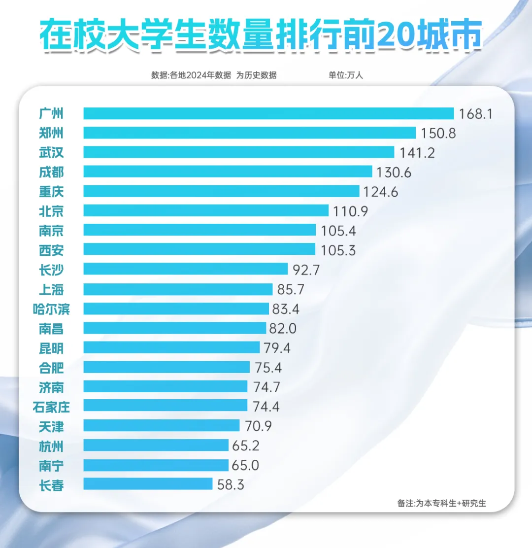 放眼全国,共有8座城市在校大学生超过百万人,广州则以168万在校大学生蝉联第一城。算下来,在广州几乎每10个人中就有1个在校大学生,人才密度之高可见一斑。广州不缺大学,也不缺大学生,这在一定程度上为广州加快产业转型升级提供了人才输送基础。