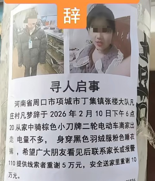 寻人启事显示,2月10日下午6点20分,周口市项城市丁集镇凡梦辞从家中骑棕色小刀牌二轮电动车离家出走,电量不多,身穿黑色羽绒服粉色睡衣裤,希望广大朋友看见后联系家长或报警110提供线索者重谢5万元,安全送到家里重谢10万元。