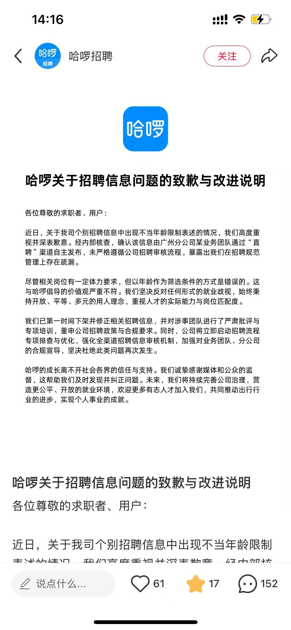 记者留意到,针对该争议,3月2日,哈啰在官方账号“哈啰招聘”已发布致歉声明。哈啰表示,关于公司个别招聘信息中出现不当年龄限制表述的情况,公司高度重视并深表歉意,经内部核查,确认该信息由广州分公司某业务团队通过“直聘”渠道自主发布,未严格遵循公司招聘审核流程,暴露出公司在招聘规范管理上存在疏漏。