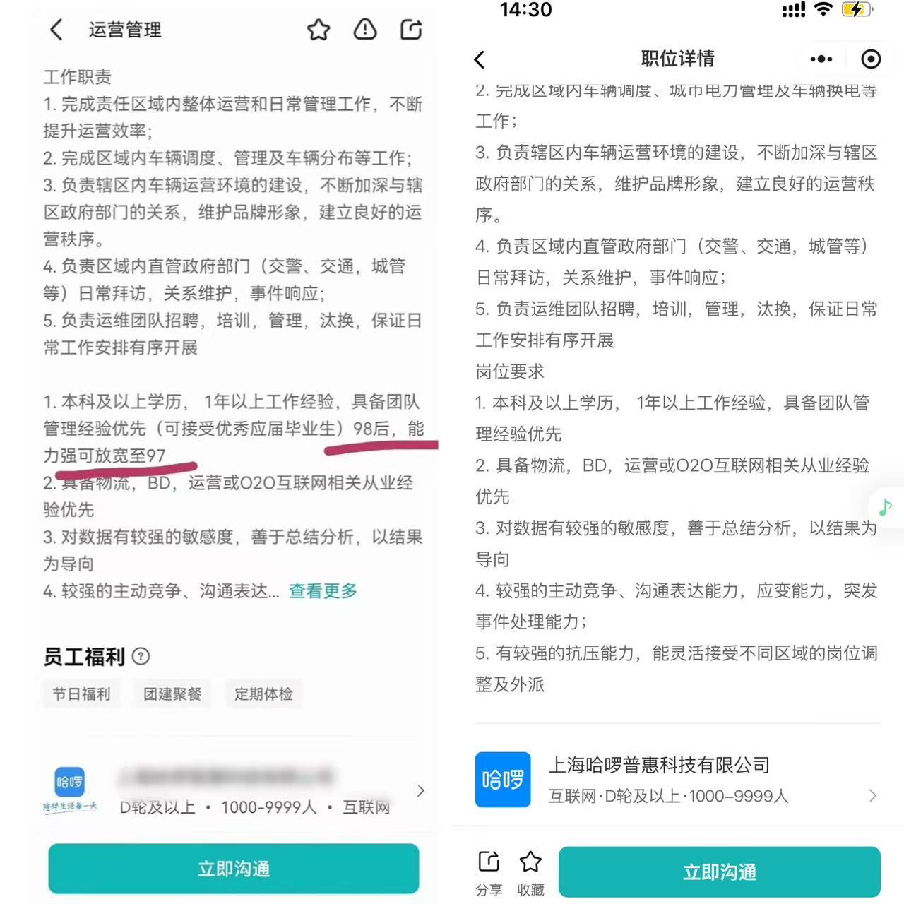 左图为网友在社交平台发布哈啰争议招聘信息图片;右图为3月3日查询相关岗位招聘要求的截图